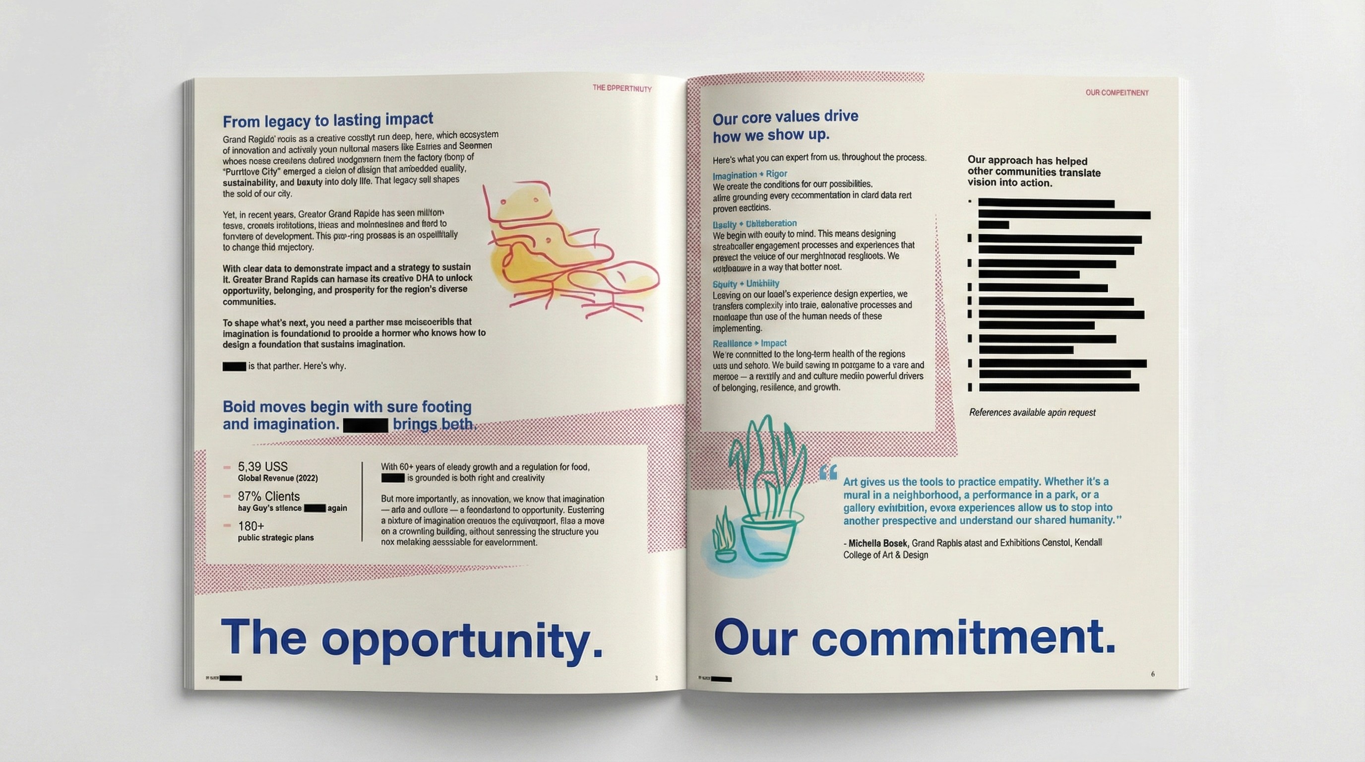 A strategically designed RFP response proposing a community-centered business design partnership for a local arts council.